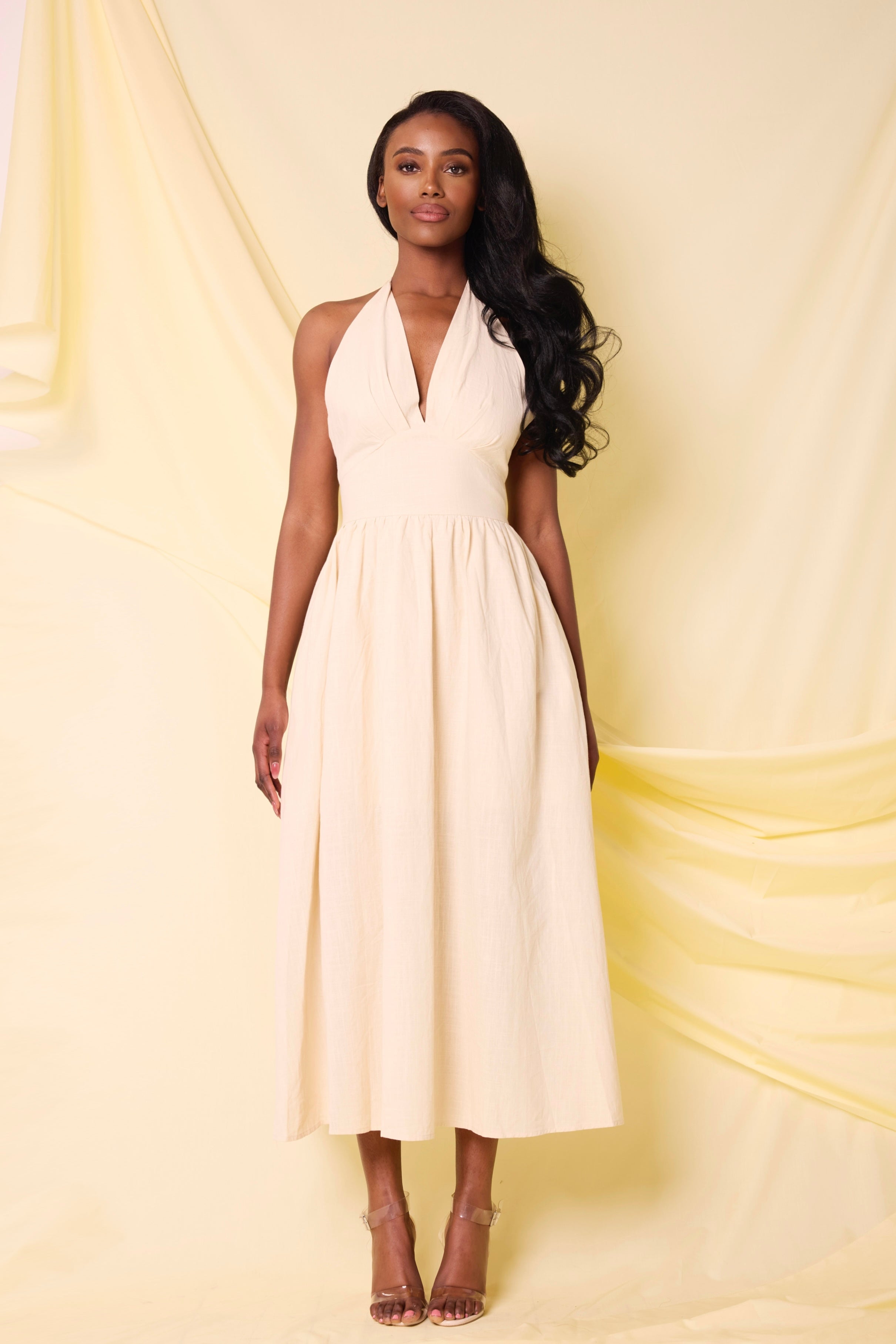 Introducing the LYRA dress this elegant and lightweight beige spring dress features a flowy silhouette, perfect for warm days. Effortlessly stylish and comfortable for any occasion. Also available in white.
