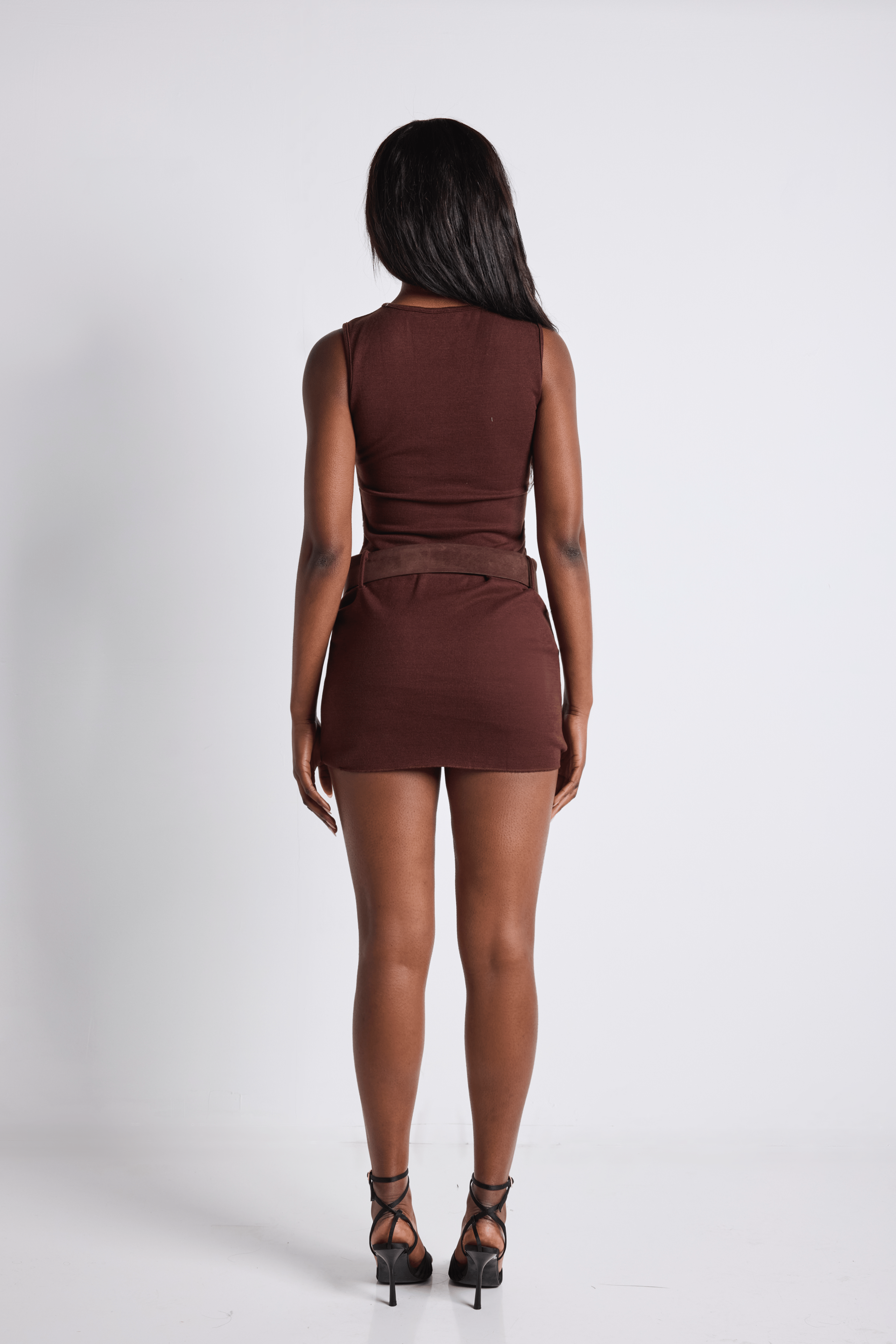 Your perfect outfit is finally sorted with this brown dress. This dress is brought to you in a knit material with a high neck design & low rise belt that is sure to add all the edge to your look.
