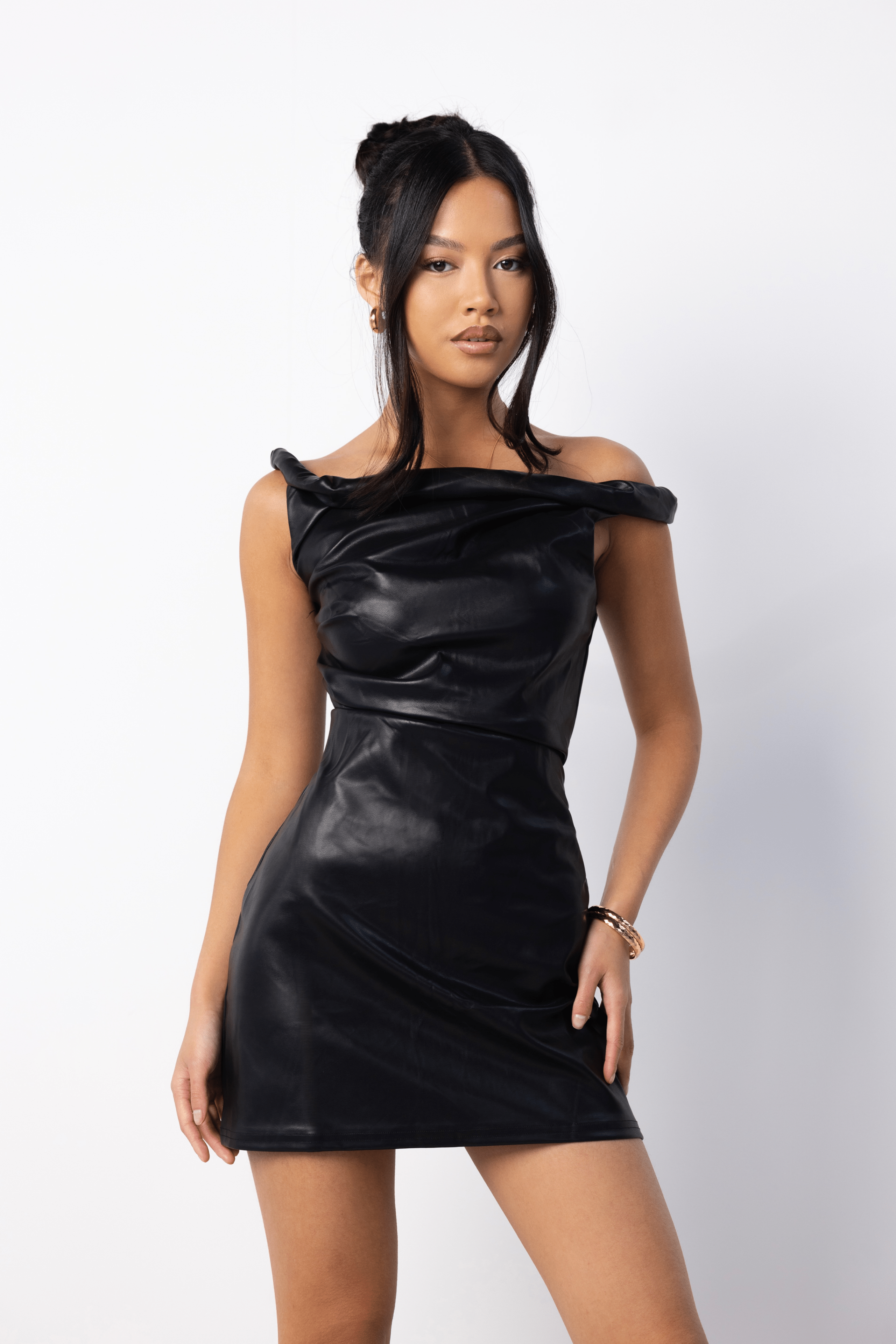 Amp up your new season wardrobe with this dress. Featuring a black faux leather material with an off shoulder twist design, what's not to love?