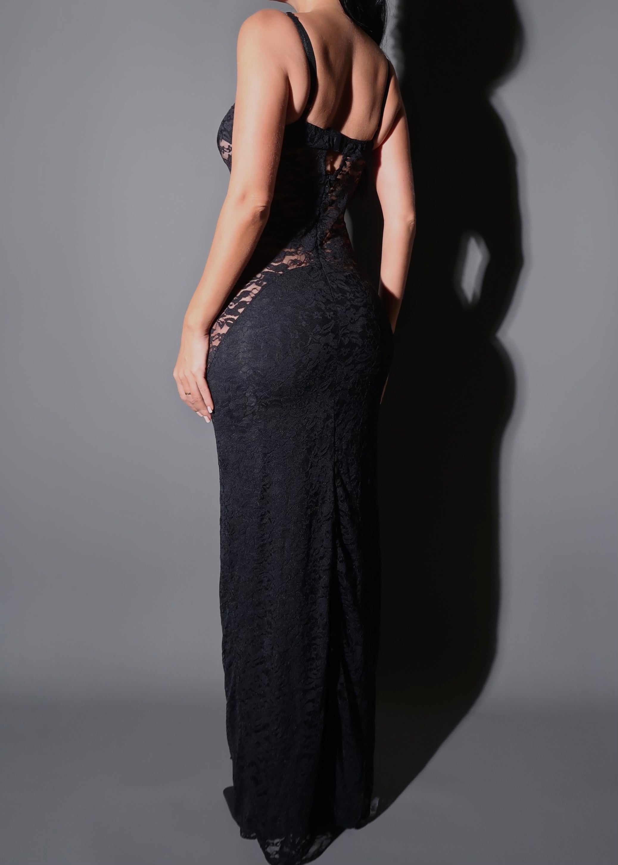 Made from our luxurious lace fabric for a premium feel. Designed for sculpting curves.  LINA features a black lace fabric with a lace tie side detailing, sculpting design & maxi length.