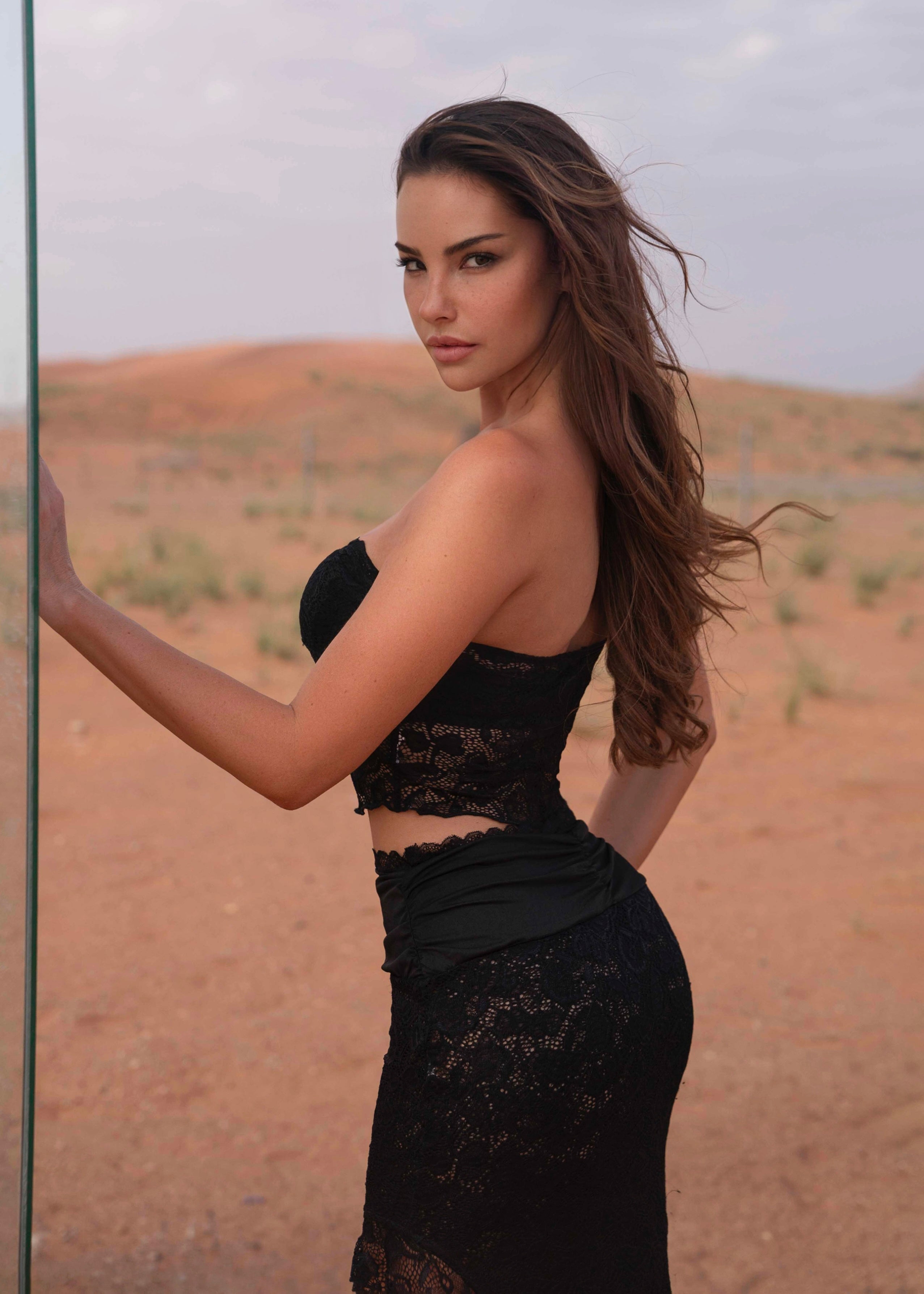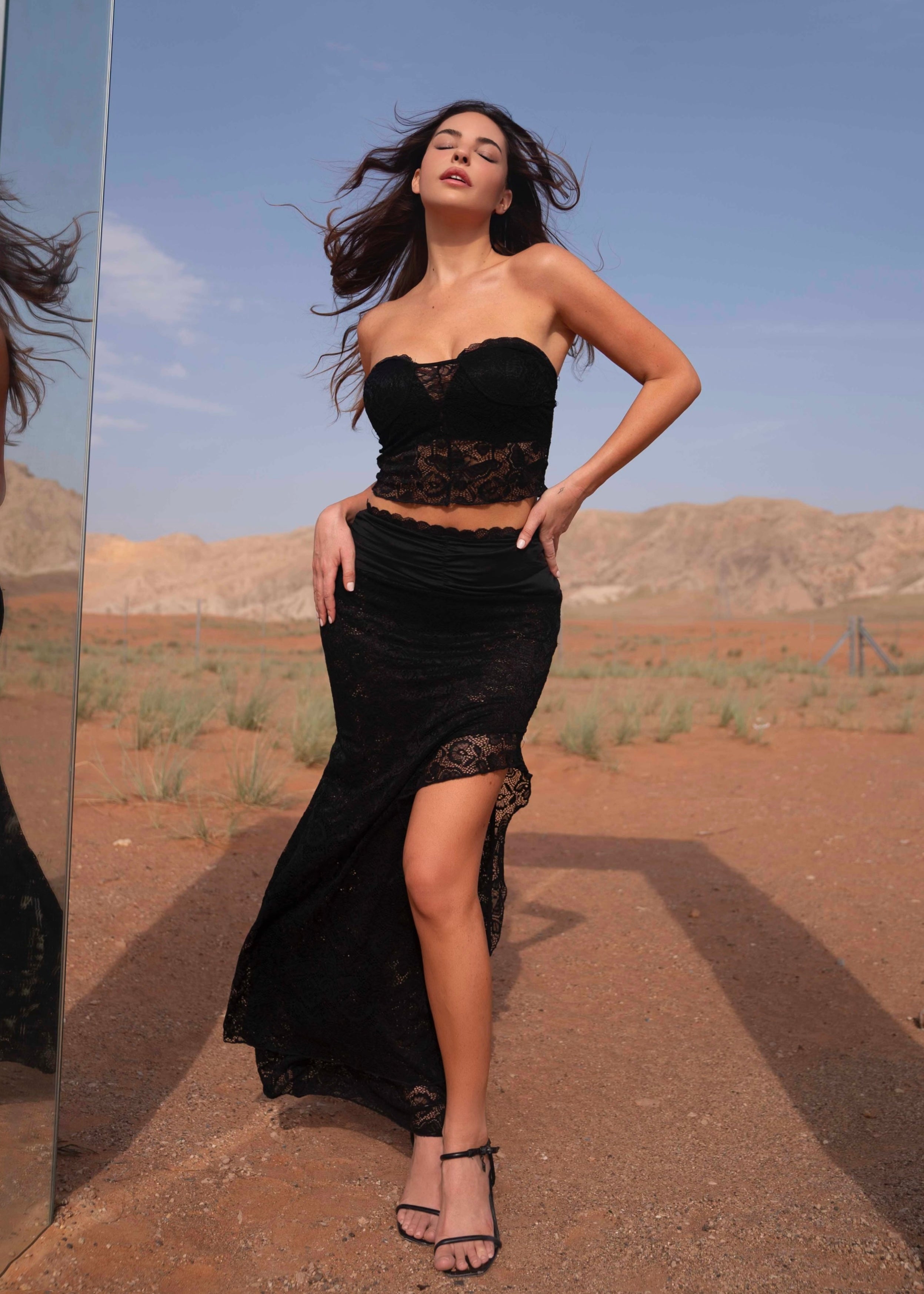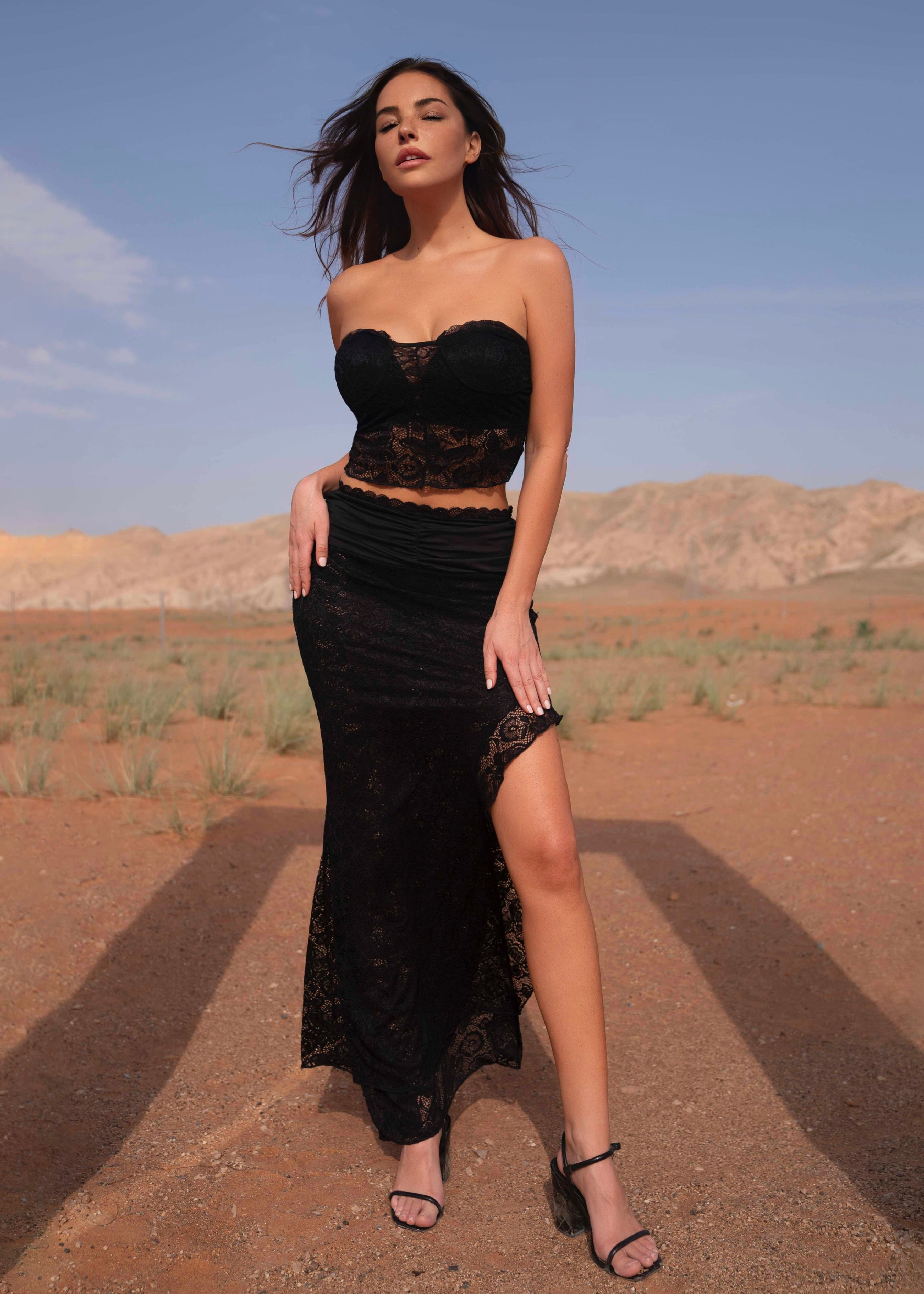 Made from our luxurious lace fabric for a premium feel. Designed for sculpting curves. REI features a black lace fabric with a lace floaty style, bandeau design top & matching maxi skirt.