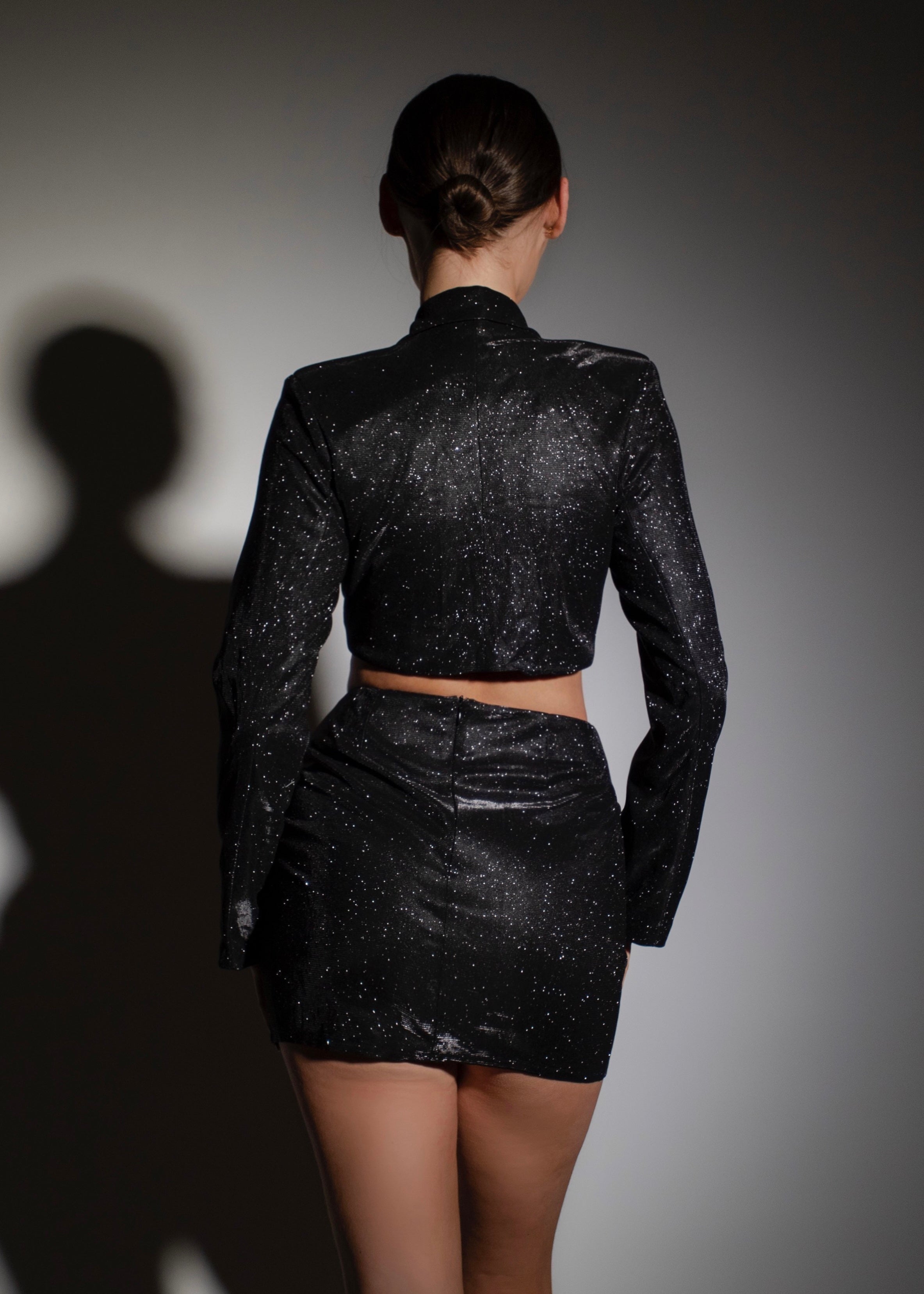 Make them stop and stare in this Black set. Brought to you in a black material with glitter detailing for that extra touch of luxe, featuring a glitter cropped blazer and matching mini skirt, how can you resist?
