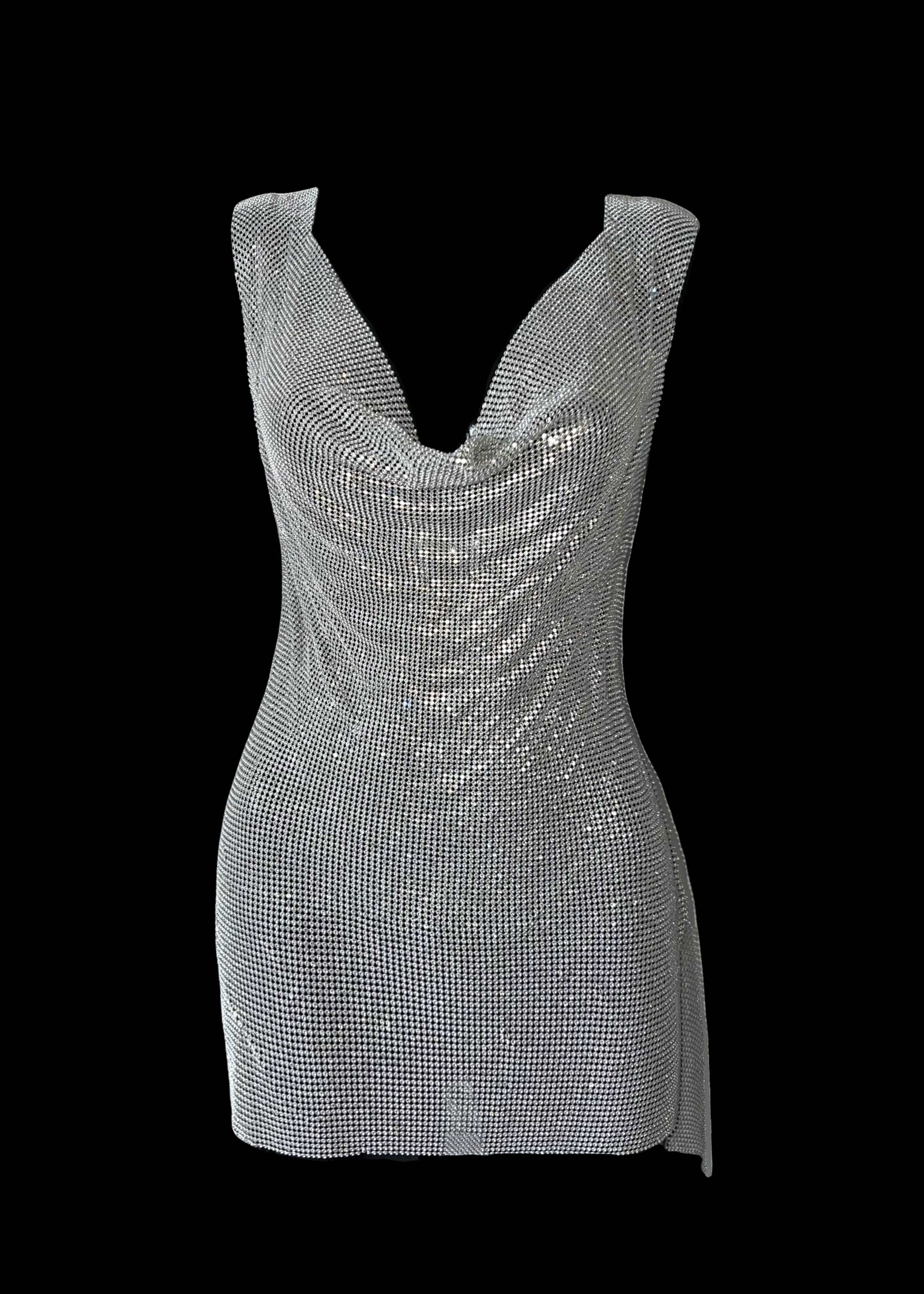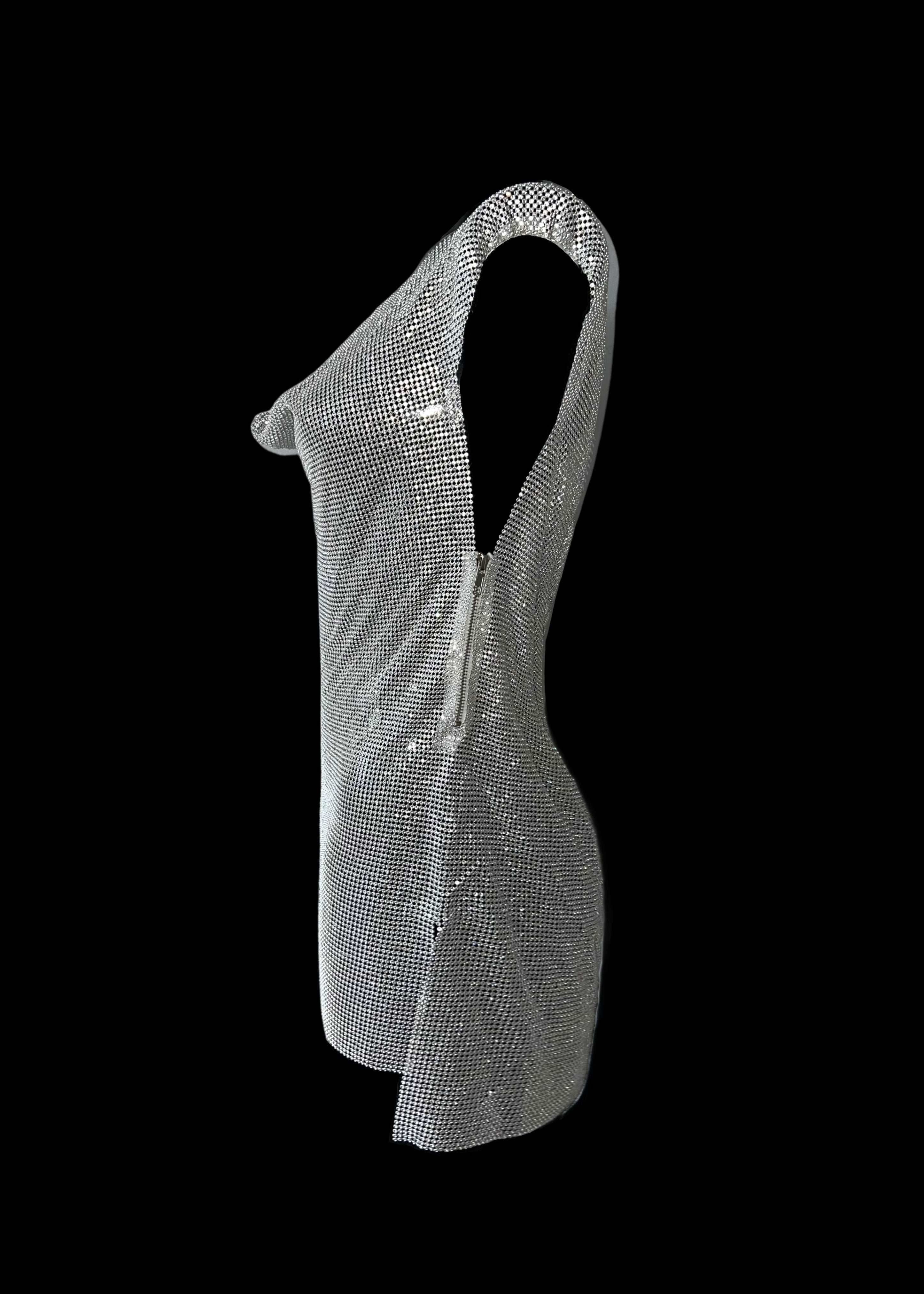 Please note: this dress is handmade from a rhinestone and aluminium fabric, making it extremely delicate with no stretch. If you are in between sizes, especially in the hips area, please purchase a size up. Due to the delicate nature of the material, we ask that you treat the garment with care and avoid applying extreme tension to the fabric.
