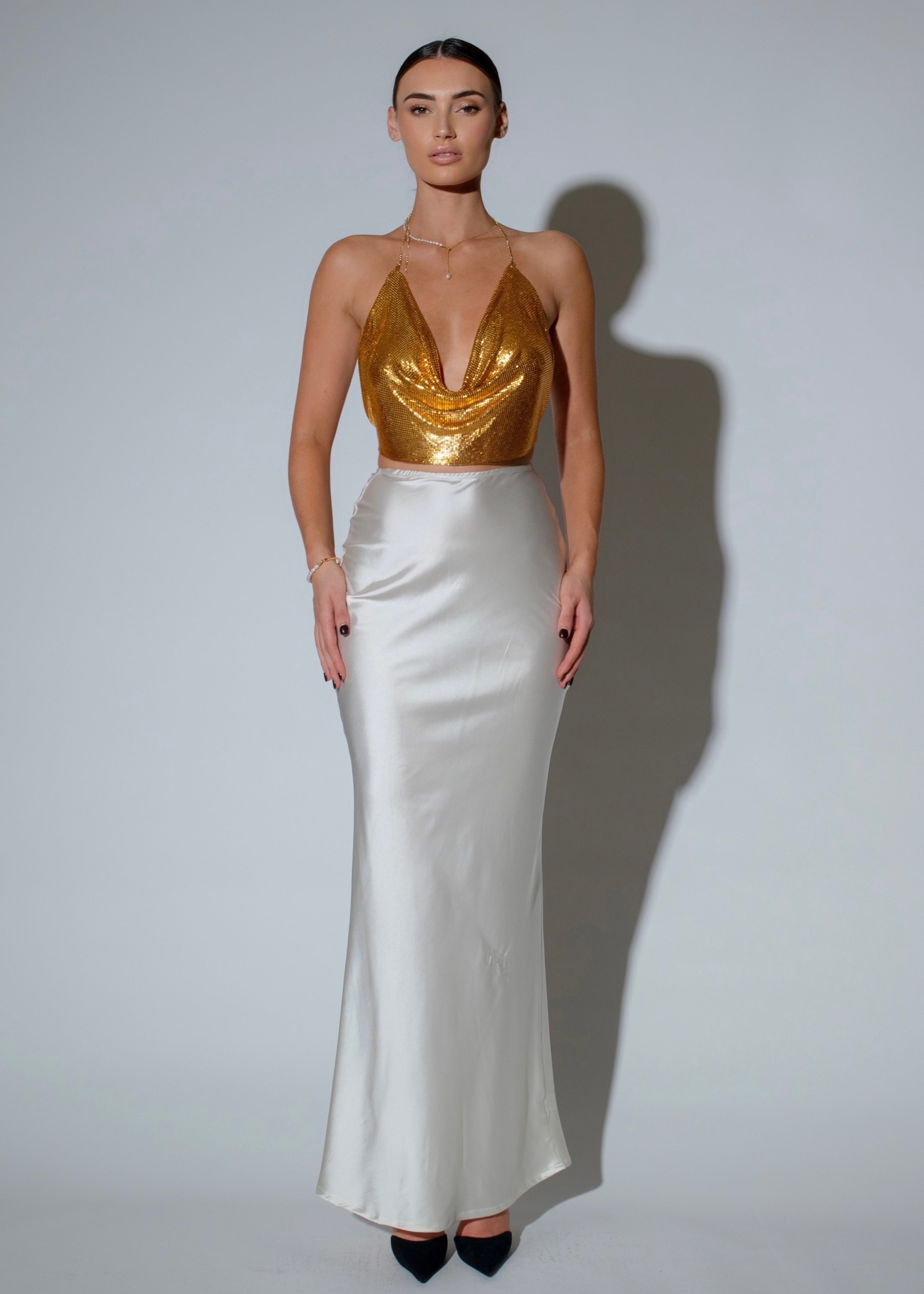 Make them stop and stare in this Gold chainmail halter neck plunge crop top. Brought to you in a gold chainmail material with chain straps for that extra touch of luxe, how can you resist? Style this with statement accessories, for a look that is sure to make you stand out from the crowd for all the right reasons.
